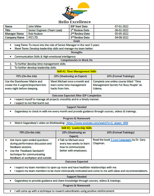 An IDP is a structured and personalized roadmap designed to help a leader enhance their skills, capabilities, and competencies in order to achieve professional and organizational goals. An IDP outlines developmental objectives, identifies the steps and resources needed to achieve them, and provides a timeline for their progress. Each competency would be developed through the 70-20-10 model of learning, and would be tracked through regular homework and exercises. To build rapport and trust, the frequency of meetings is recommended to be high in the beginning of the program (once in two weeks), and then should slow down in the middle (once a month), and speed up again towards the end (once in two weeks). After the conclusion of the program, Hello Excellence would provide you with a detailed report outlining the progress made by the leader and the way forward.